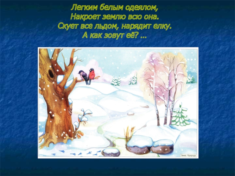 Легким белым одеялом, Накроет землю всю она. Скует все льдом, нарядит елку. А как зовут её? …