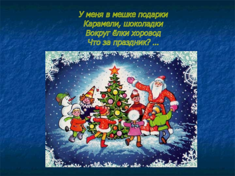 У меня в мешке подарки Карамели, шоколадки Вокруг ёлки хоровод Что за праздник? …