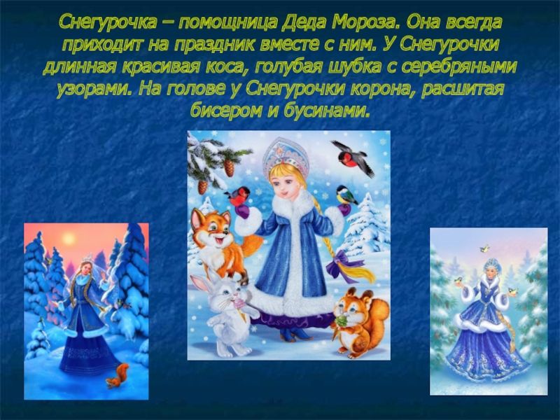 Снегурочка – помощница Деда Мороза. Она всегда приходит на праздник вместе с ним. У Снегурочки длинная красивая