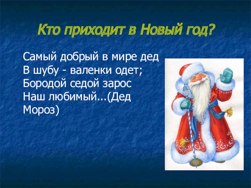 Кто приходит в Новый год?Самый добрый в мире дедВ шубу - валенки одет; Бородой седой зарос Наш