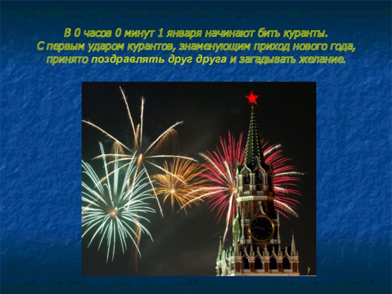Слайд 7В 0 часов 0 минут 1 января начинают бить куранты. С