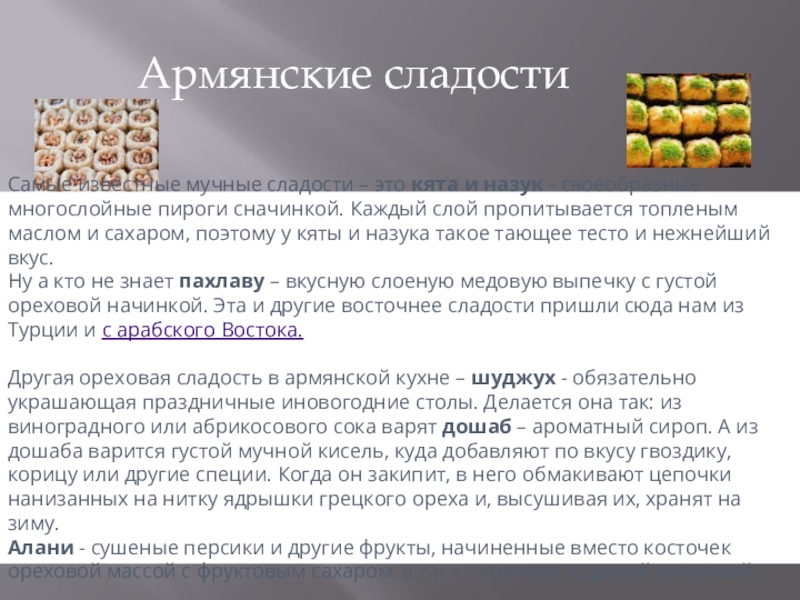 Армянские сладости Самые известные мучные сладости – это кята и назук - своеобразные многослойные пироги сначинкой. Каждый слой пропитывается