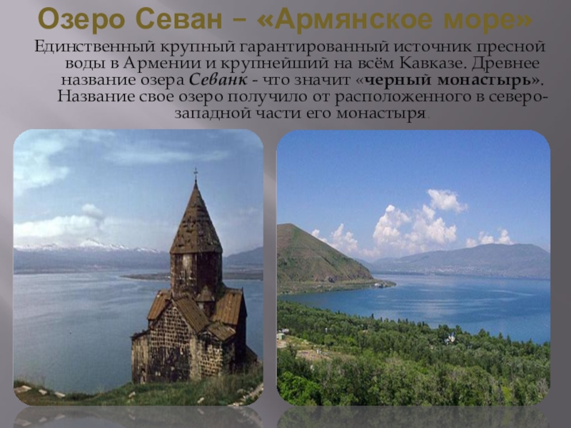 Армении и крупнейший на всём Кавказе. Древнее название озера Севанк - что значит «черный монастырь». Название свое озеро получило от расположенного в северо-западной части его монастыря.