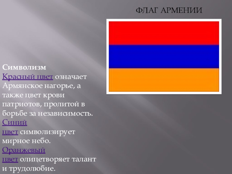 Флаг АрменииСимволизмКрасный цвет означает Армянское нагорье, а также цвет крови патриотов, пролитой в борьбе за независимость.Синий цвет символизирует мирное