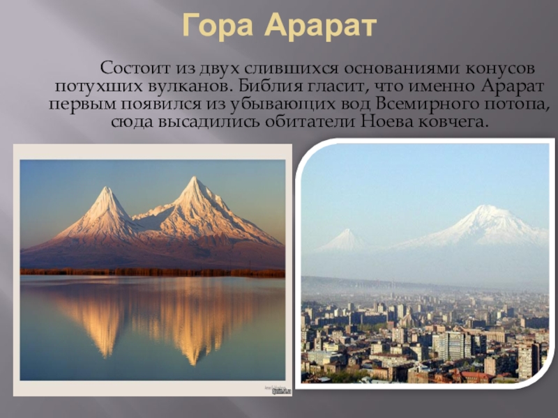 Гора Арарат       Состоит из двух слившихся основаниями конусов потухших вулканов. Библия