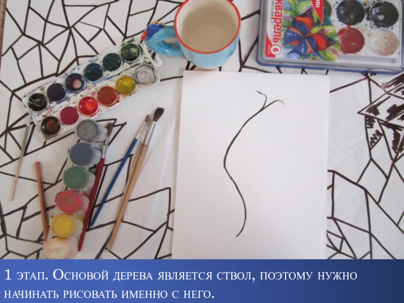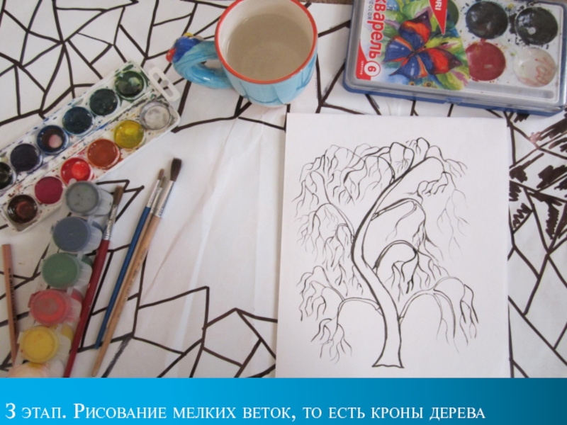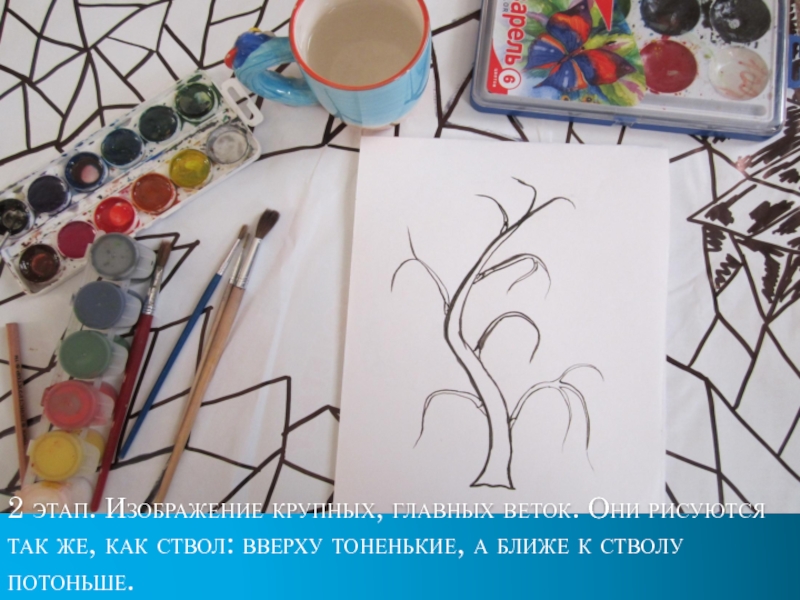 Слайд 92 этап. Изображение крупных, главных веток. Они рисуются так же, как
