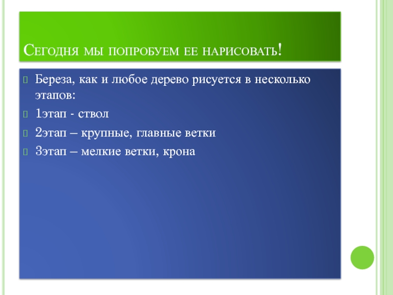 Сегодня мы попробуем ее нарисовать!Береза, как и любое дерево рисуется в несколько этапов:1этап - ствол2этап – крупные,