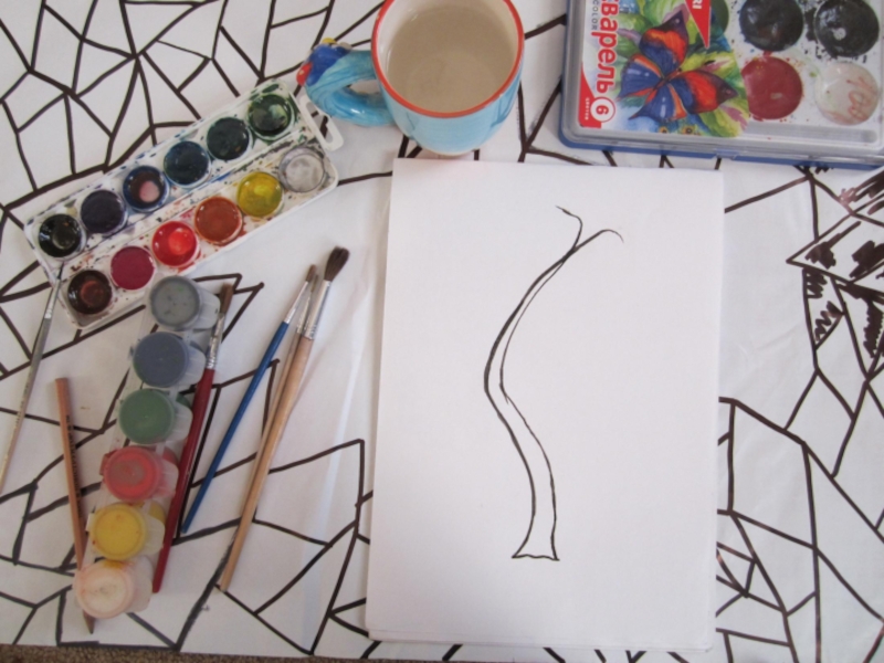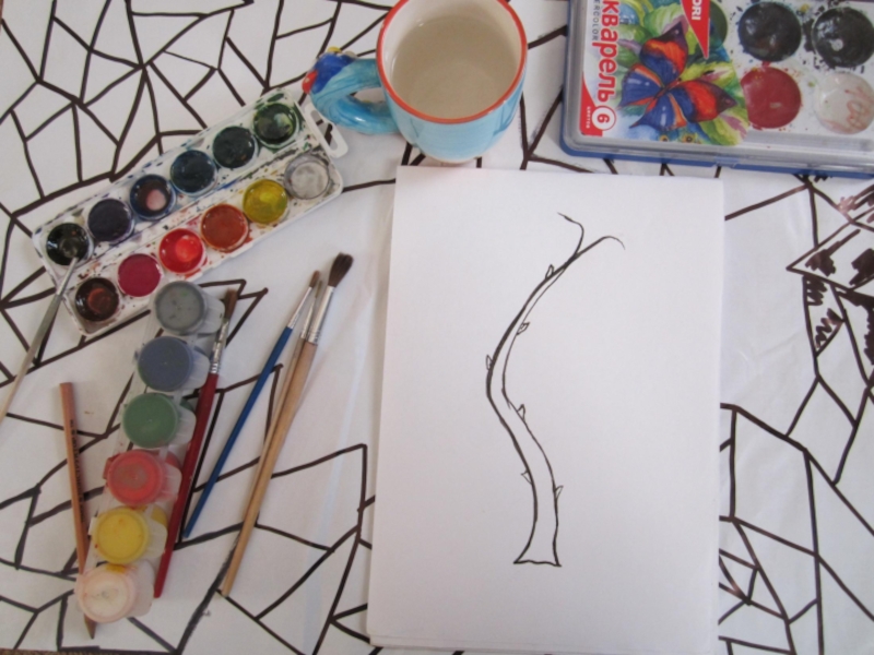 2 этап. Изображение крупных, главных веток. Они рисуются так же, как ствол: вверху тоненькие, а ближе к