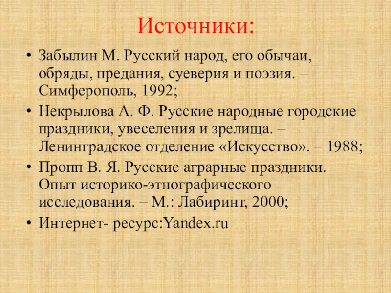 Некрылова А. Ф. Русские народные городские праздники, увеселения и зрелища. – Ленинградское отделение «Искусство». – 1988;