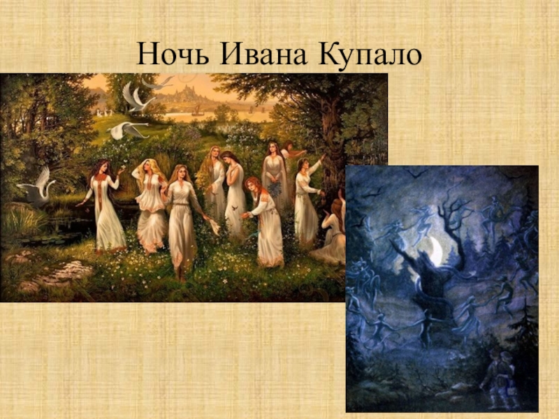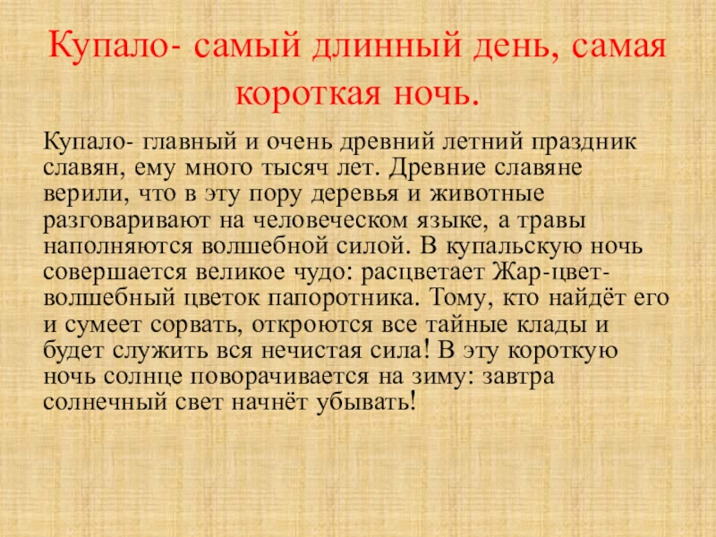 летний праздник славян, ему много тысяч лет. Древние славяне верили, что в эту пору деревья и животные разговаривают на человеческом языке, а травы наполняются волшебной силой. В купальскую ночь совершается великое чудо: расцветает Жар-цвет- волшебный цветок папоротника. Тому, кто найдёт его и сумеет сорвать, откроются все тайные клады и будет служить вся нечистая сила! В эту короткую ночь солнце поворачивается на зиму: завтра солнечный свет начнёт убывать!