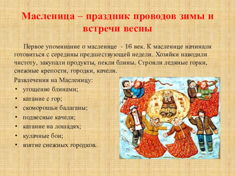 Слайд 4Масленица – праздник проводов зимы и встречи весны
