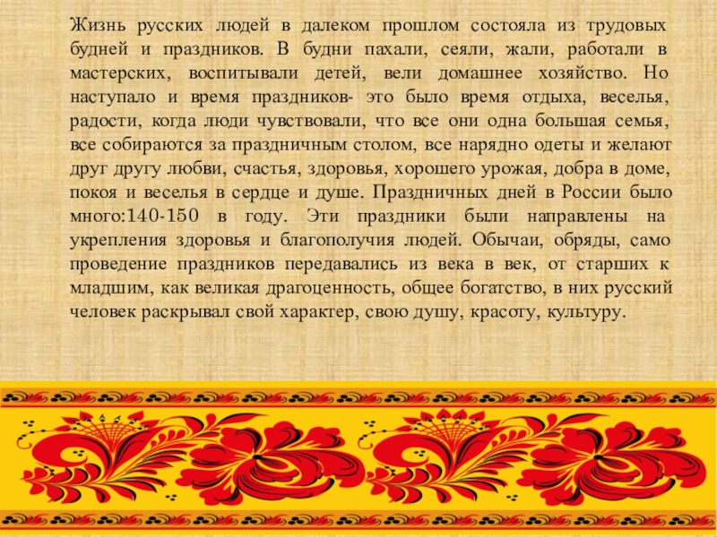 праздников. В будни пахали, сеяли, жали, работали в мастерских, воспитывали детей, вели домашнее хозяйство. Но наступало и время праздников- это было время отдыха, веселья, радости, когда люди чувствовали, что все они одна большая семья, все собираются за праздничным столом, все нарядно одеты и желают друг другу любви, счастья, здоровья, хорошего урожая, добра в доме, покоя и веселья в сердце и душе. Праздничных дней в России было много:140-150 в году. Эти праздники были направлены на укрепления здоровья и благополучия людей. Обычаи, обряды, само проведение праздников передавались из века в век, от старших к младшим, как великая драгоценность, общее богатство, в них русский человек раскрывал свой характер, свою душу, красоту, культуру.