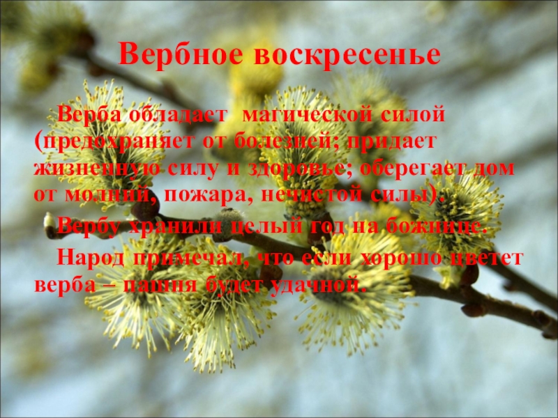 Верба обладает магической силой (предохраняет от болезней; придает жизненную силу
