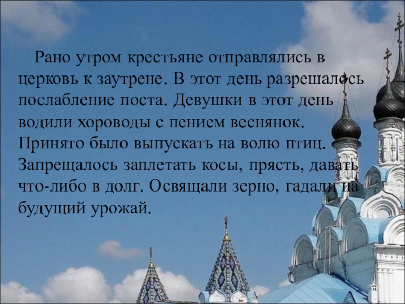 Слайд 9Рано утром крестьяне отправлялись в церковь к заутрене. В этот день