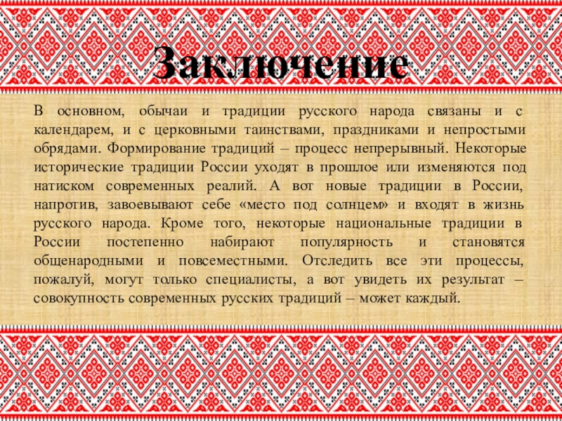 и с церковными таинствами, праздниками и непростыми обрядами. Формирование традиций – процесс непрерывный. Некоторые исторические традиции России уходят в прошлое или изменяются под натиском современных реалий. А вот новые традиции в России, напротив, завоевывают себе «место под солнцем» и входят в жизнь русского народа. Кроме того, некоторые национальные традиции в России постепенно набирают популярность и становятся общенародными и повсеместными. Отследить все эти процессы, пожалуй, могут только специалисты, а вот увидеть их результат – совокупность современных русских традиций – может каждый.