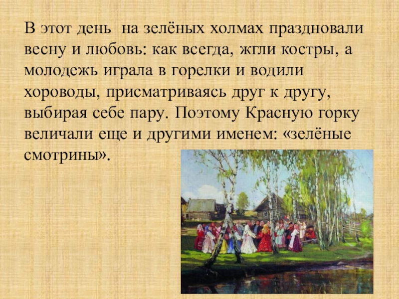всегда, жгли костры, а молодежь играла в горелки и водили хороводы, присматриваясь друг к другу, выбирая себе пару. Поэтому Красную горку величали еще и другими именем: «зелёные смотрины».