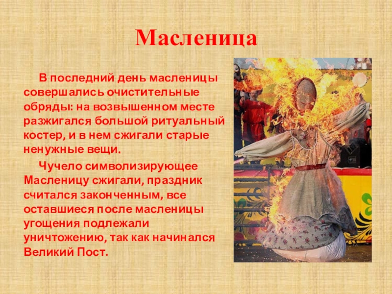 Чучело символизирующее Масленицу сжигали, праздник считался законченным, все оставшиеся после масленицы угощения подлежали уничтожению, так как начинался Великий Пост.