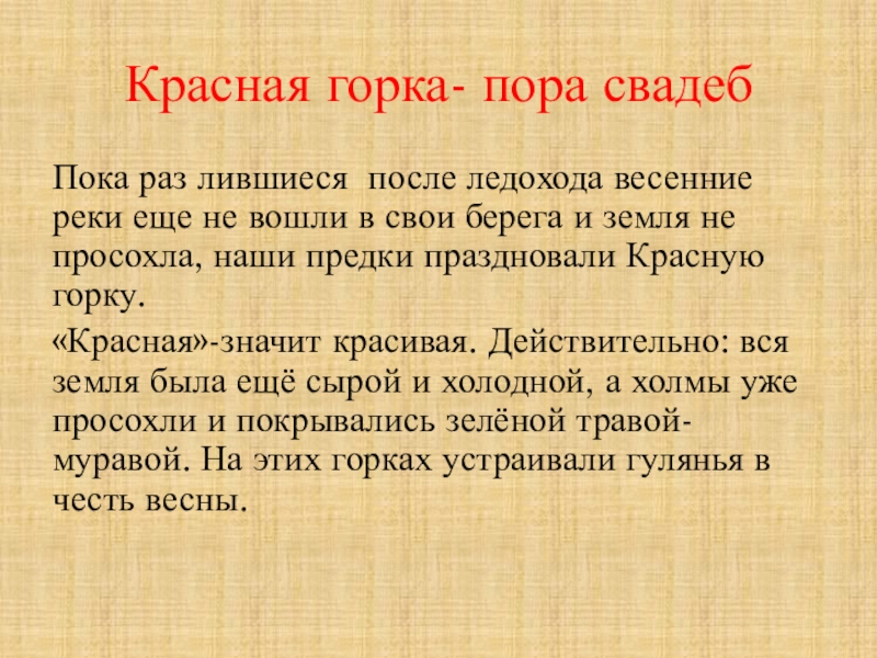 «Красная»-значит красивая. Действительно: вся земля была ещё сырой и холодной, а холмы уже просохли и покрывались зелёной травой-муравой. На этих горках устраивали гулянья в честь весны.