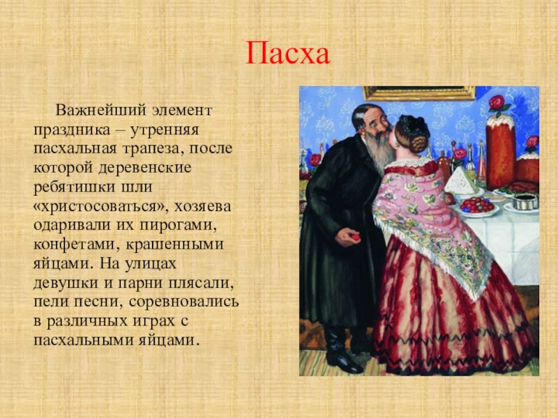 шли «христосоваться», хозяева одаривали их пирогами, конфетами, крашенными яйцами. На улицах девушки и парни плясали, пели песни, соревновались в различных играх с пасхальными яйцами.
