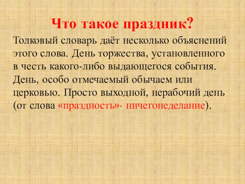 установленного в честь какого-либо выдающегося события. День, особо отмечаемый обычаем или церковью. Просто выходной, нерабочий день (от слова «праздность»- ничегонеделание).