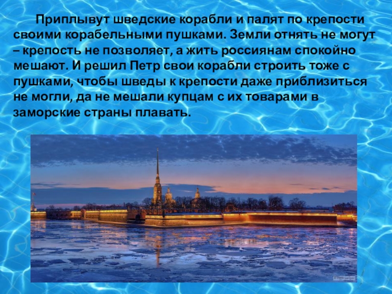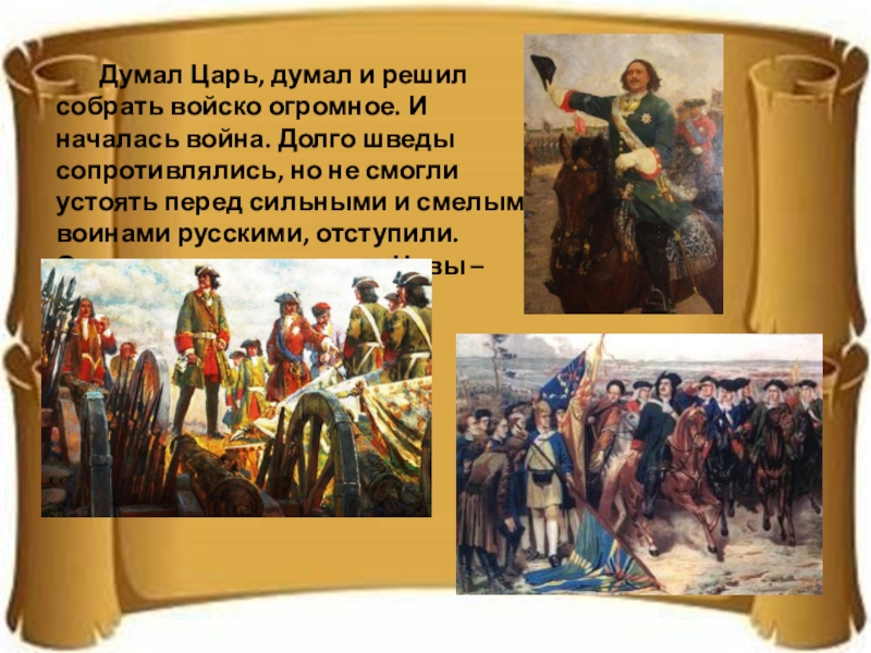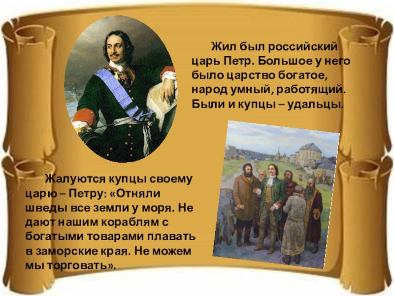 Жалуются купцы своему царю – Петру: «Отняли шведы все земли у моря. Не дают нашим кораблям с богатыми товарами плавать в заморские края. Не можем мы торговать».