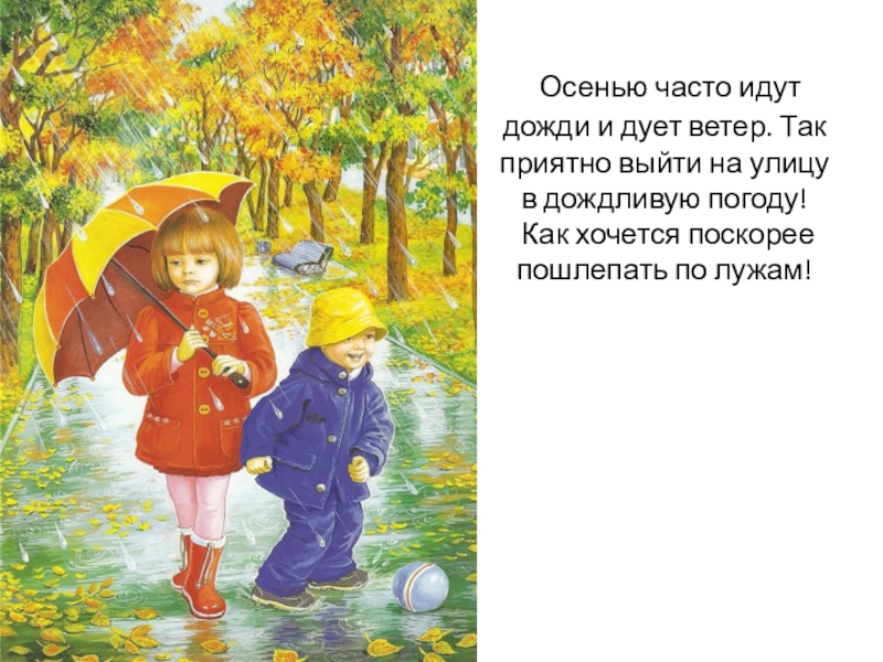 Слайд 4  Осенью часто идут дожди и дует ветер. Так приятно выйти на