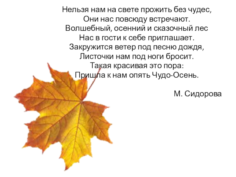 Нельзя нам на свете прожить без чудес,Они нас повсюду встречают.Волшебный, осенний и сказочный лесНас в гости к