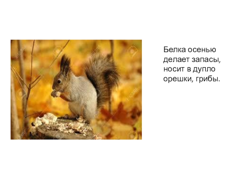 Белка осенью делает запасы, носит в дупло орешки, грибы.