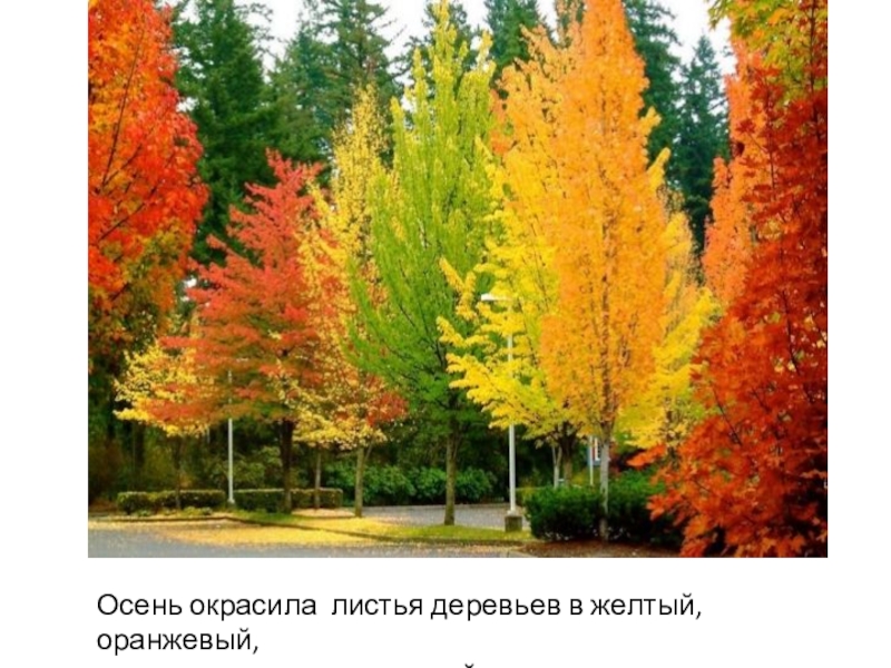 Слайд 3Осень окрасила листья деревьев в желтый, оранжевый,