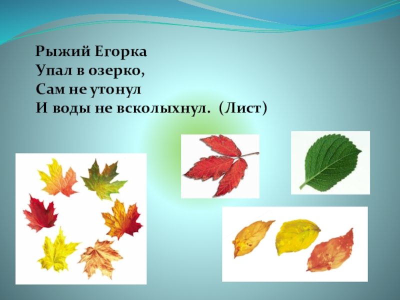 Слайд 7 Рыжий Егорка Упал в озерко, Сам не утонул И воды не всколыхнул. (Лист)