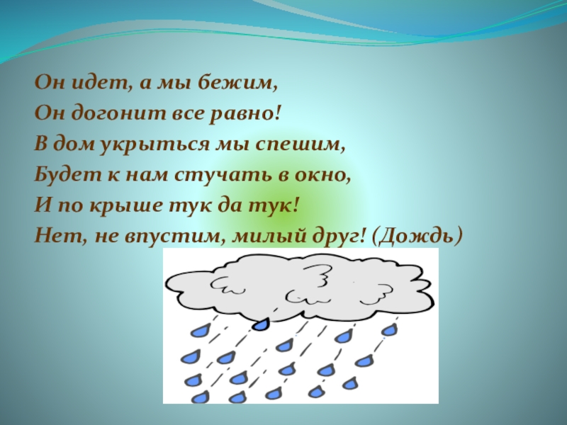 Он идет, а мы бежим,Он догонит все равно!В дом укрыться мы спешим,Будет к нам стучать в окно,И