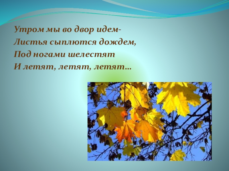 Утром мы во двор идем-Листья сыплются дождем,Под ногами шелестятИ летят, летят, летят…