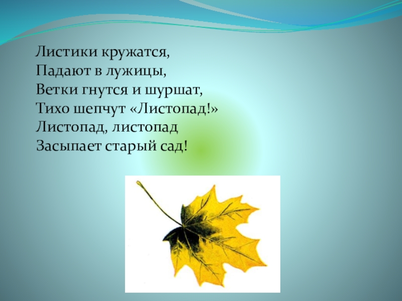 Слайд 8 Листики кружатся, Падают в лужицы, Ветки гнутся и шуршат, Тихо шепчут «Листопад!» Листопад,