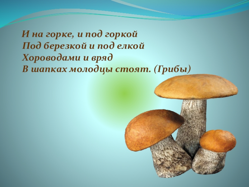 елкой Хороводами и вряд В шапках молодцы стоят. (Грибы)
