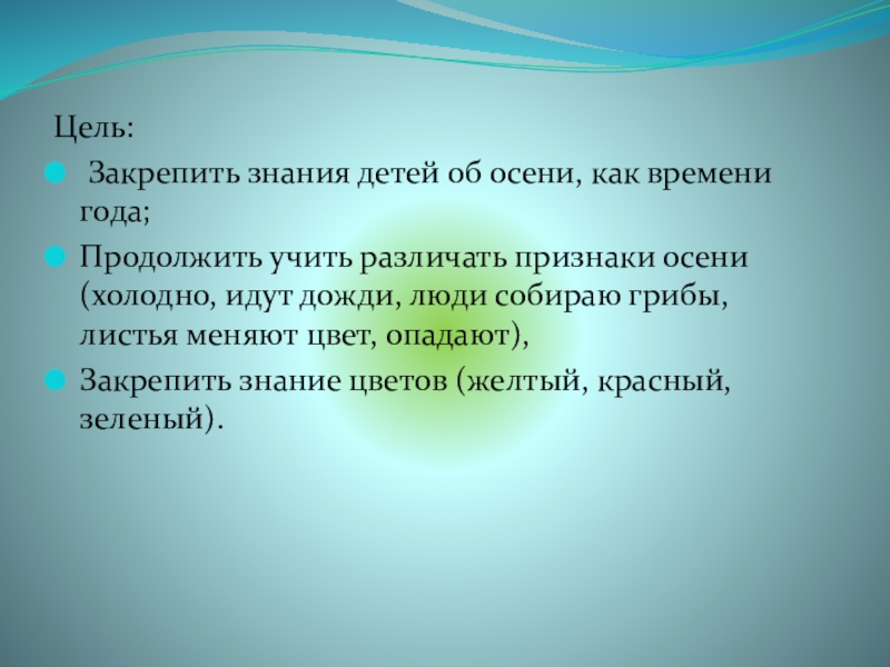 Цель: Закрепить знания детей об осени, как времени года;Продолжить учить различать признаки осени (холодно, идут дожди, люди собираю грибы, листья меняют цвет, опадают), Закрепить знание цветов (желтый, красный, зеленый).