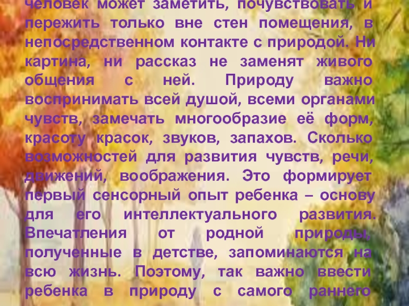 только вне стен помещения, в непосредственном контакте с природой. Ни картина, ни рассказ не заменят живого общения с ней. Природу важно воспринимать всей душой, всеми органами чувств, замечать многообразие её форм, красоту красок, звуков, запахов. Сколько возможностей для развития чувств, речи, движений, воображения. Это формирует первый сенсорный опыт ребенка – основу для его интеллектуального развития. Впечатления от родной природы, полученные в детстве, запоминаются на всю жизнь. Поэтому, так важно ввести ребенка в природу с самого раннего возраста.