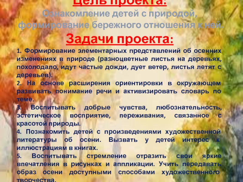 5. Воспитывать стремление отразить свои яркие впечатления в рисунках и аппликации. Учить передавать образ осени доступными способами художественного творчества.