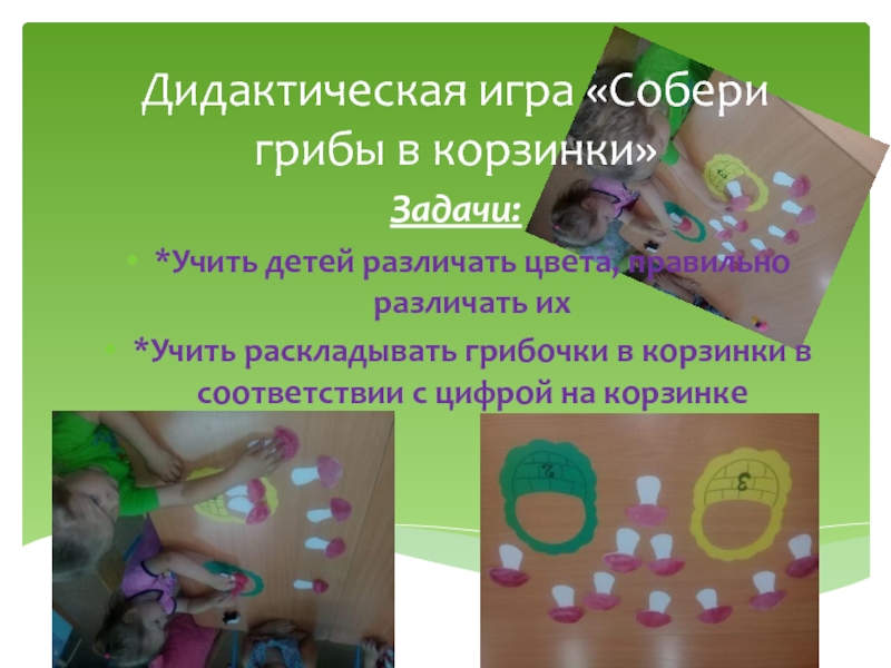 Слайд 7Дидактическая игра «Собери грибы в корзинки»