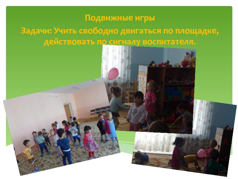 Задачи: Учить свободно двигаться по площадке, действовать по сигналу воспитателя.