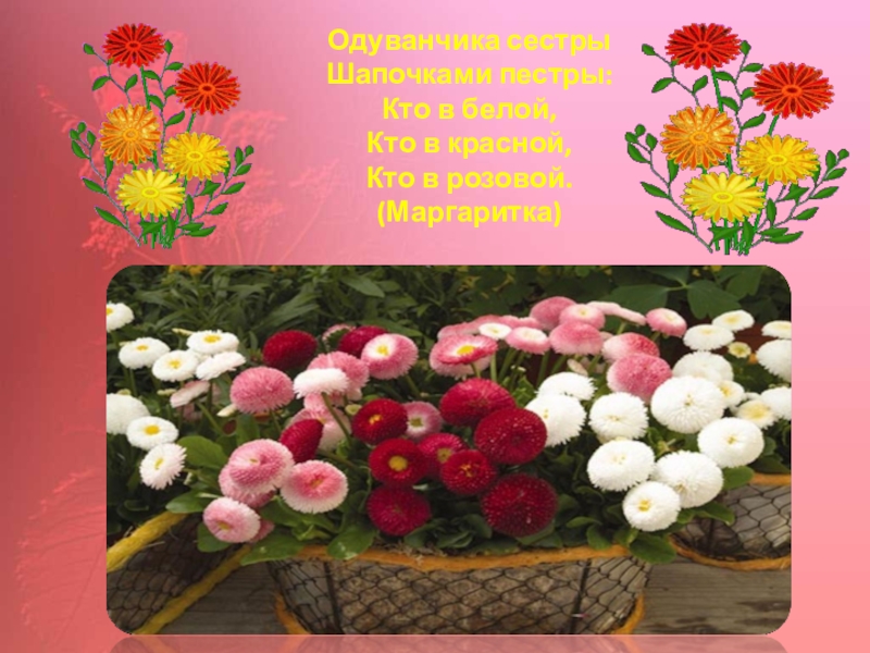 Слайд 13Одуванчика сестры Шапочками пестры: Кто в белой, Кто в красной, Кто в розовой.  (Маргаритка)