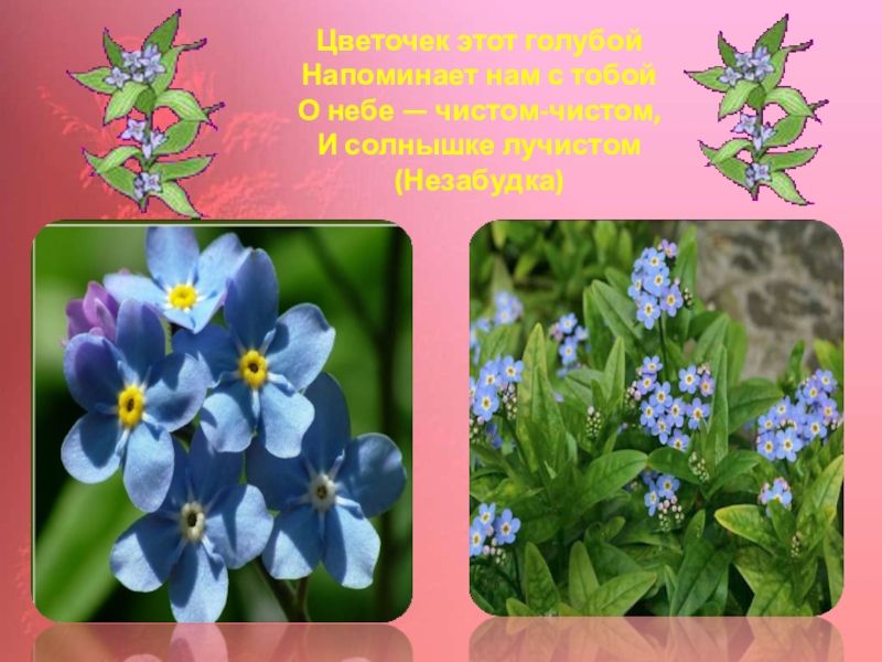 Слайд 7Цветочек этот голубой Напоминает нам с тобой О небе — чистом-чистом, И солнышке лучистом (Незабудка)
