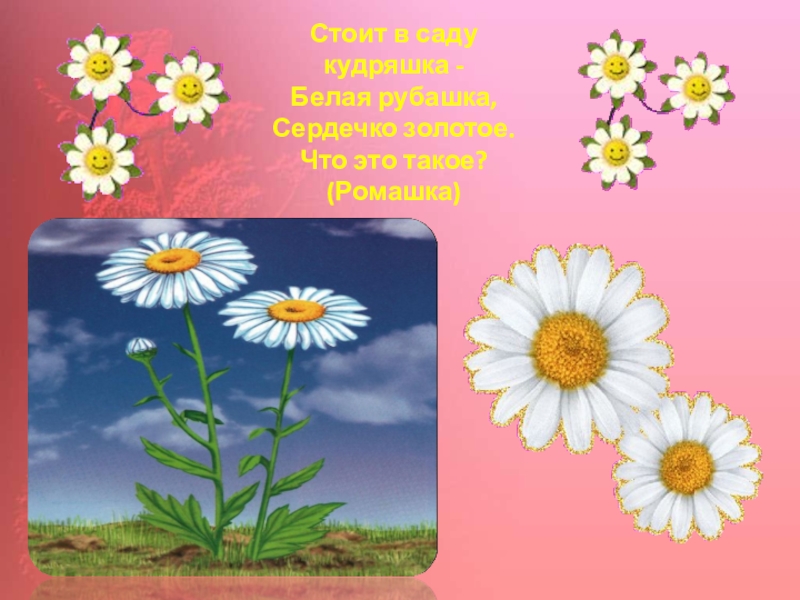 Слайд 3Стоит в саду кудряшка - Белая рубашка, Сердечко золотое. Что это такое? (Ромашка)