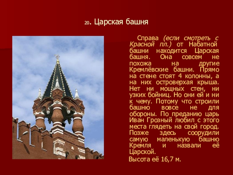 Набатной башни находится Царская башня. Она совсем не похожа на другие Кремлёвские башни. Прямо на стене стоят 4 колонны, а на них островерхая крыша. Нет ни мощных стен, ни узких бойниц. Но они ей и ни к чему. Потому что строили башню вовсе не для обороны. По преданию царь Иван Грозный любил с этого места глядеть на свой город. Позже здесь соорудили самую маленькую башню Кремля и назвали её Царской.