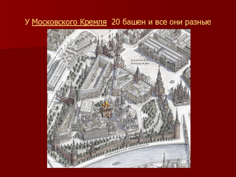 Слайд 2У Московского Кремля 20 башен и все они разные