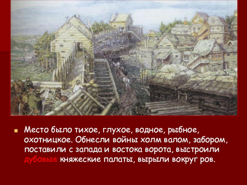 Слайд 5Место было тихое, глухое, водное, рыбное, охотницкое. Обнесли войны холм валом,