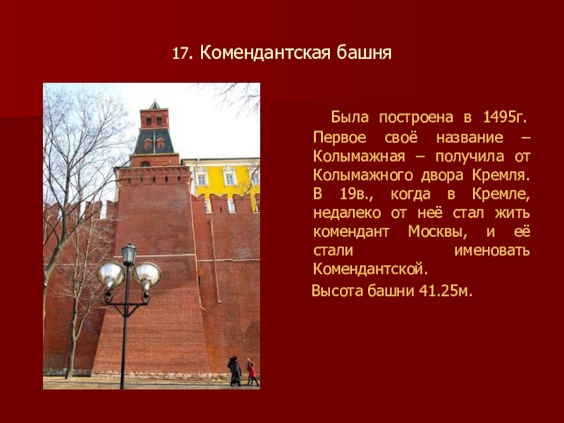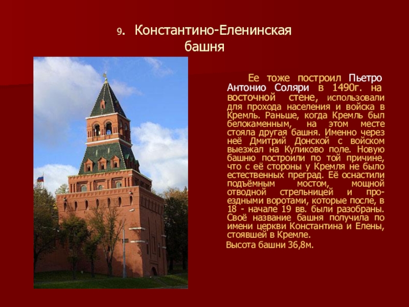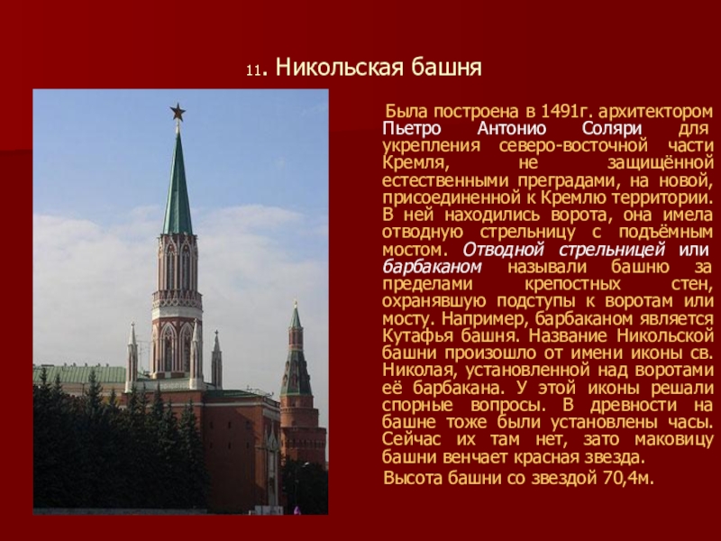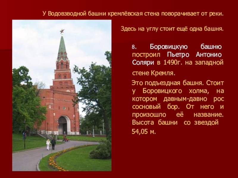 8. Боровицкую башню построил Пьетро Антонио Соляри в 1490г. на западной стене Кремля.