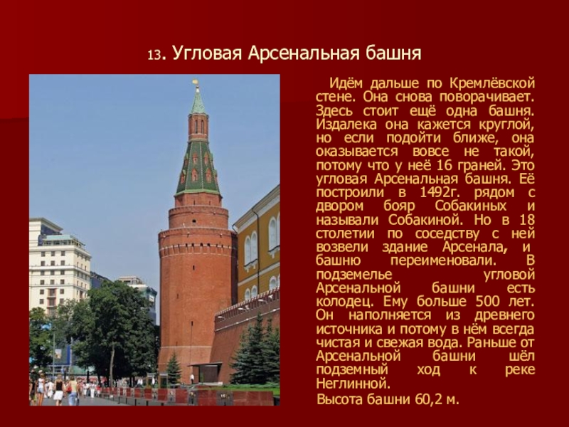 Она снова поворачивает. Здесь стоит ещё одна башня. Издалека она кажется круглой, но если подойти ближе, она оказывается вовсе не такой, потому что у неё 16 граней. Это угловая Арсенальная башня. Её построили в 1492г. рядом с двором бояр Собакиных и называли Собакиной. Но в 18 столетии по соседству с ней возвели здание Арсенала, и башню переименовали. В подземелье угловой Арсенальной башни есть колодец. Ему больше 500 лет. Он наполняется из древнего источника и потому в нём всегда чистая и свежая вода. Раньше от Арсенальной башни шёл подземный ход к реке Неглинной.