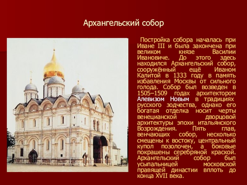 закончена при великом князе Василии Ивановиче. До этого здесь находился Архангельский собор, сооружённый ещё Иваном Калитой в 1333 году в память избавления Москвы от сильного голода. Собор был возведен в 1505–1509 годах архитектором Алевизом Новым в традициях русского зодчества, однако его богатая отделка носит черты венецианской дворцовой архитектуры эпохи итальянского Возрождения. Пять глав, венчающих собор, несколько смещены к востоку, центральный купол позолочен, а боковые покрашены серебряной краской. Архангельский собор был усыпальницей московской правящей династии вплоть до конца XVII века.