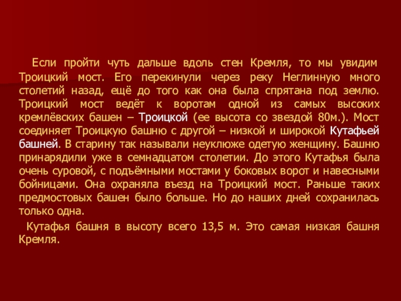 увидим Троицкий мост. Его перекинули через реку Неглинную много столетий назад, ещё до того как она была спрятана под землю. Троицкий мост ведёт к воротам одной из самых высоких кремлёвских башен – Троицкой (ее высота со звездой 80м.). Мост соединяет Троицкую башню с другой – низкой и широкой Кутафьей башней. В старину так называли неуклюже одетую женщину. Башню принарядили уже в семнадцатом столетии. До этого Кутафья была очень суровой, с подъёмными мостами у боковых ворот и навесными бойницами. Она охраняла въезд на Троицкий мост. Раньше таких предмостовых башен было больше. Но до наших дней сохранилась только одна.