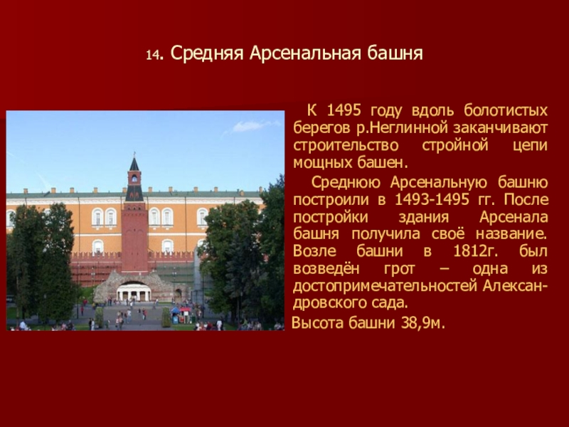 Среднюю Арсенальную башню построили в 1493-1495 гг. После постройки здания Арсенала башня получила своё название. Возле башни в 1812г. был возведён грот – одна из достопримечательностей Алексан-дровского сада.